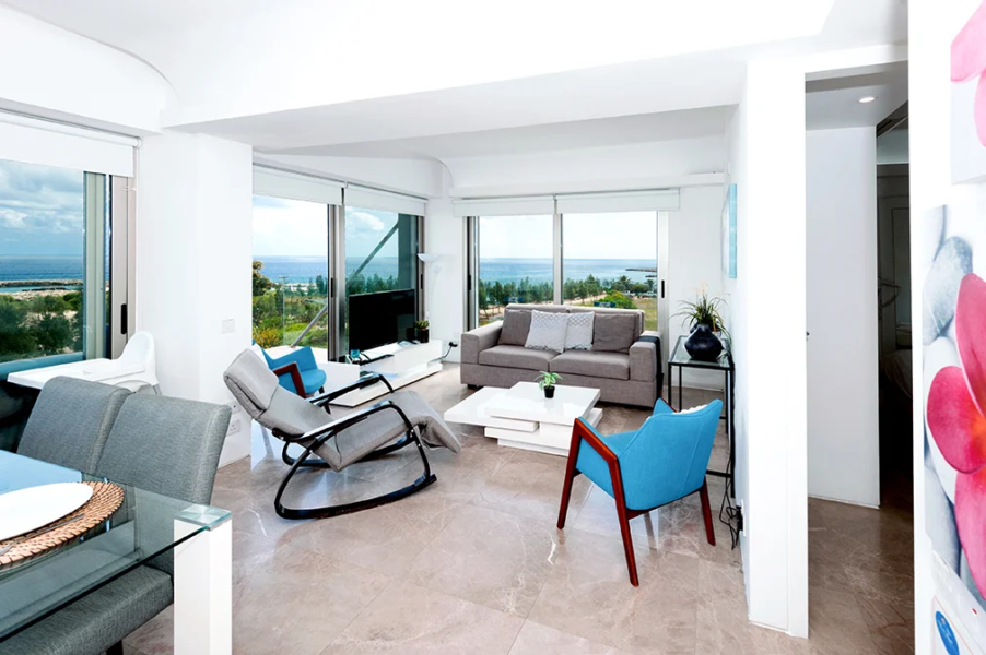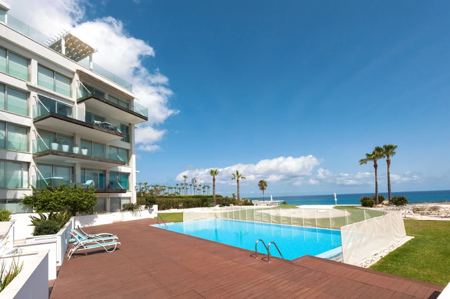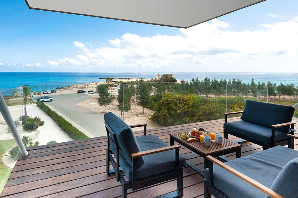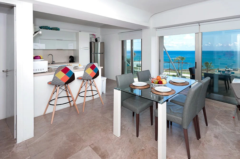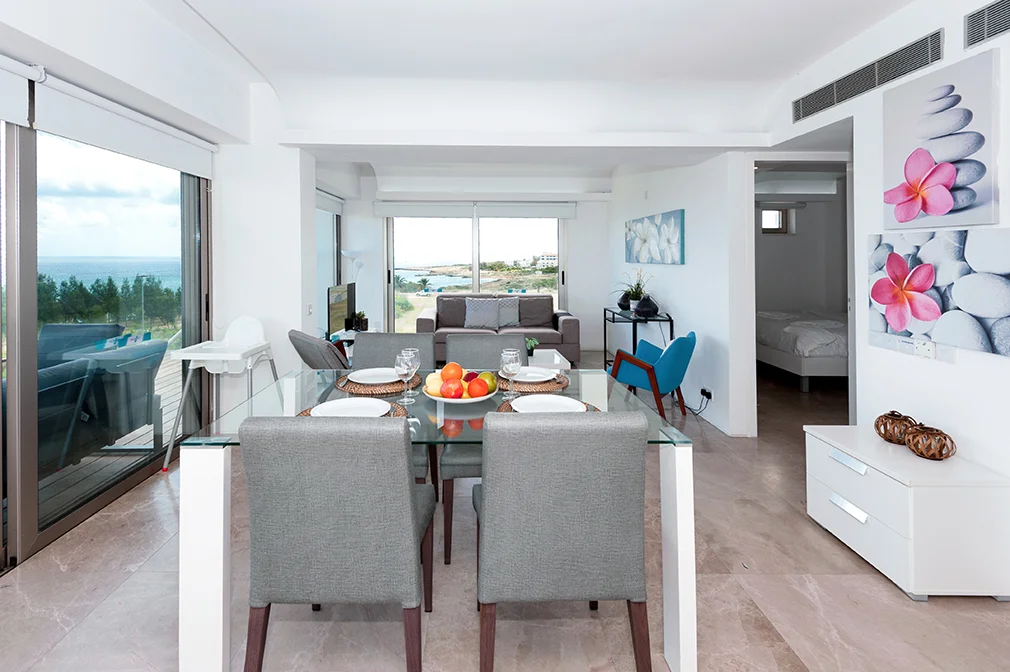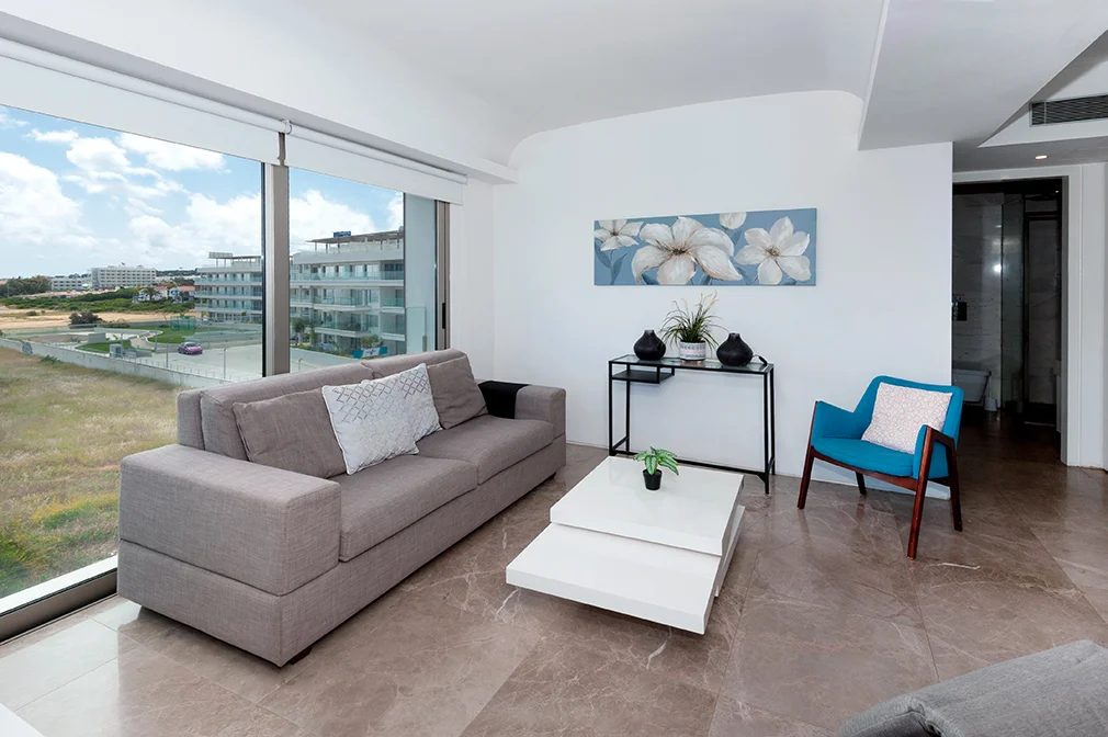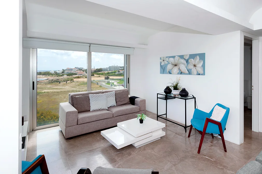 - This luxurious two bedroom apartment is ideally situated in a brand new gated sea front resort 50 metres from the beach and close to the centre of Protaras.