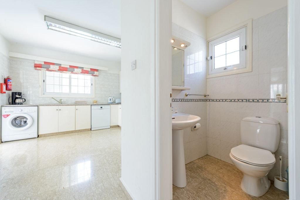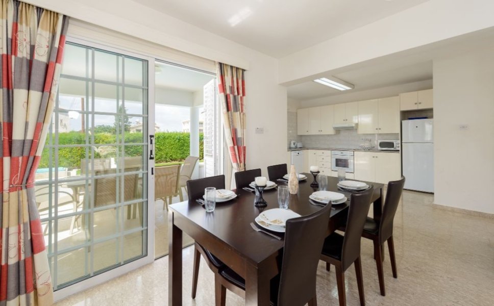 The villa has an open-plan living and dining area, with widescreen TV and comfortable seating. The kitchen has everything required for a comfortable self-catering stay. There is also a w/c on this floor.