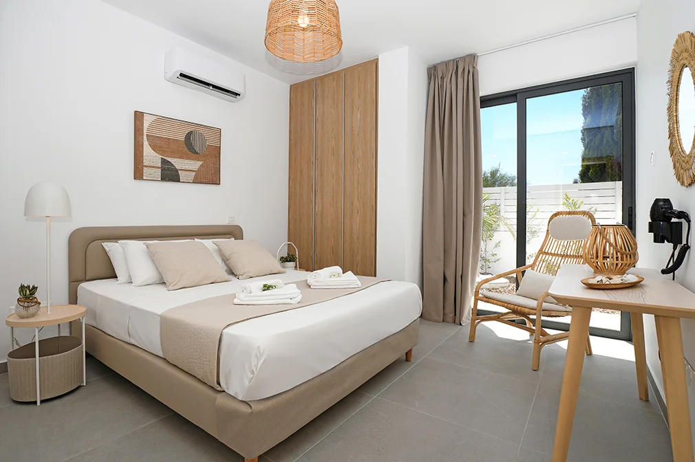 - The villa has three double bedrooms and three bathrooms; two en-suite double bedrooms on the first floor and one more double bedroom and bathroom on the ground level.