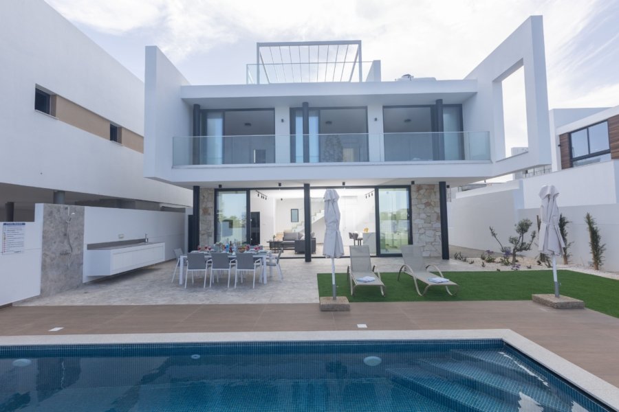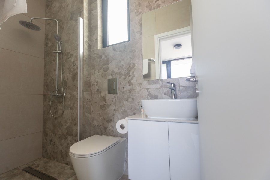 The villa boasts a spacious open-plan ground floor, where the living room, dining area, and fully equipped kitchen flow seamlessly together, creating a bright and inviting space. The contemporary interior features sleek finishes, high-quality furnishings, and an abundance of natural light. A guest shower and toilet on this level add to the convenience.