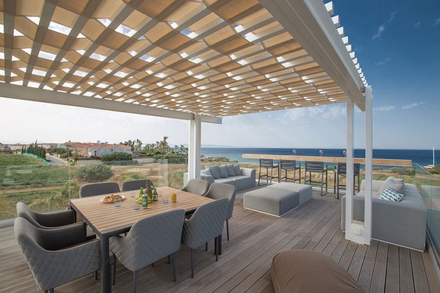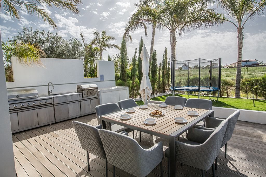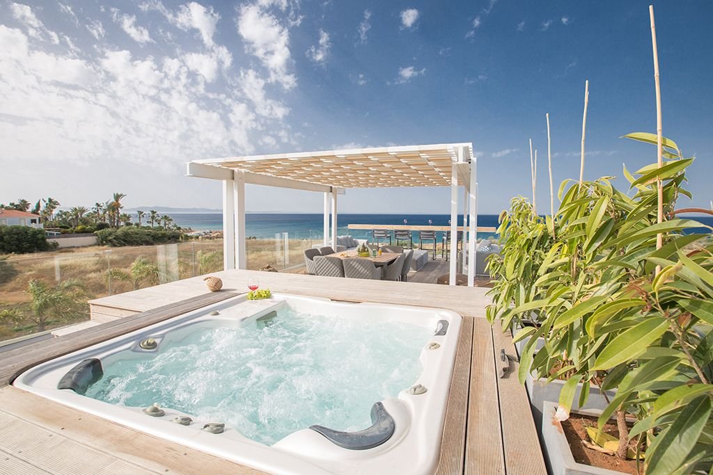 This villa also has the added luxury of a roof terrace with a complementary built-in hot tub for you to relax in, have a drink, and enjoy the stunning views. The roof terrace also includes an outdoor kitchen with a gas BBQ, a dining area, and separate seating area with a sunset bar.