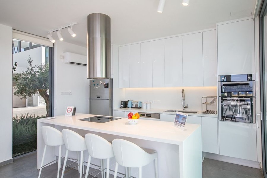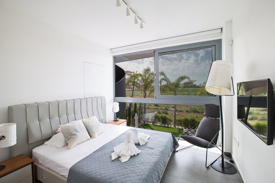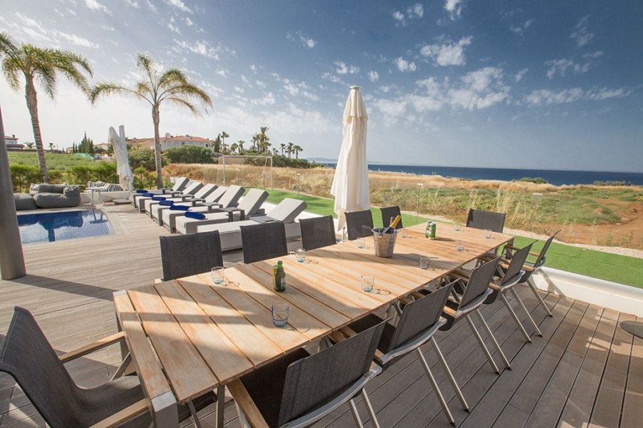 This one-of-a-kind villa stands on a plot of 300sqm of teak decking and real grass garden. As you walk into the villa, you will find the very spacious open-plan living room, kitchen and dining area. The living room has a comfortable and modern sofa set, widescreen rotating TV (can be watched while sitting in the pool) with UK and Russian satellite channels and WIFI connection with 40Mbps speed. The dining area has seating for 8 persons, and the modern kitchen is fully equipped with all appliances you need for your self-catering stay as well as a breakfast bar which has seating for an extra 4 persons. The ground floor is surrounded by large patio doors which open up completely allowing the indoor living room merge with the outdoor deck and pool making it a huge in’n’out space.
