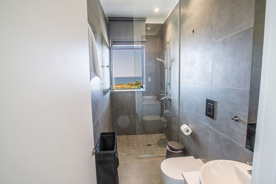 Upstairs, you will find the three bedrooms, all of which offer sea views. The master bedroom has an en suite bathroom with a shower and WC and a double bed, the second bedroom has a double bed and bedroom 3 has two single beds. All bedrooms have fitted wardrobes and bedside cabinets. In addition, there is a smart bunkbed in the hallway so the villa can accommodate 8 persons in total. The main family bathroom is also on this floor with a shower and WC.