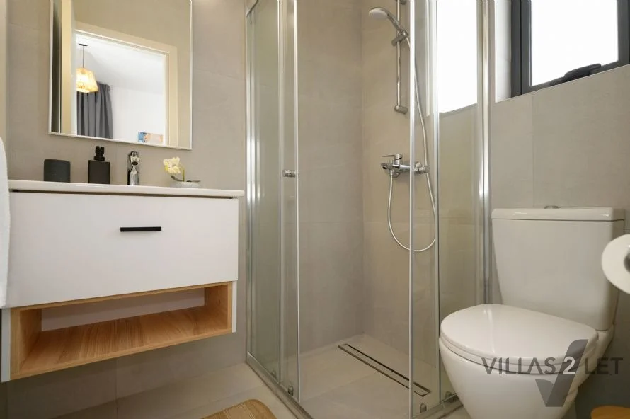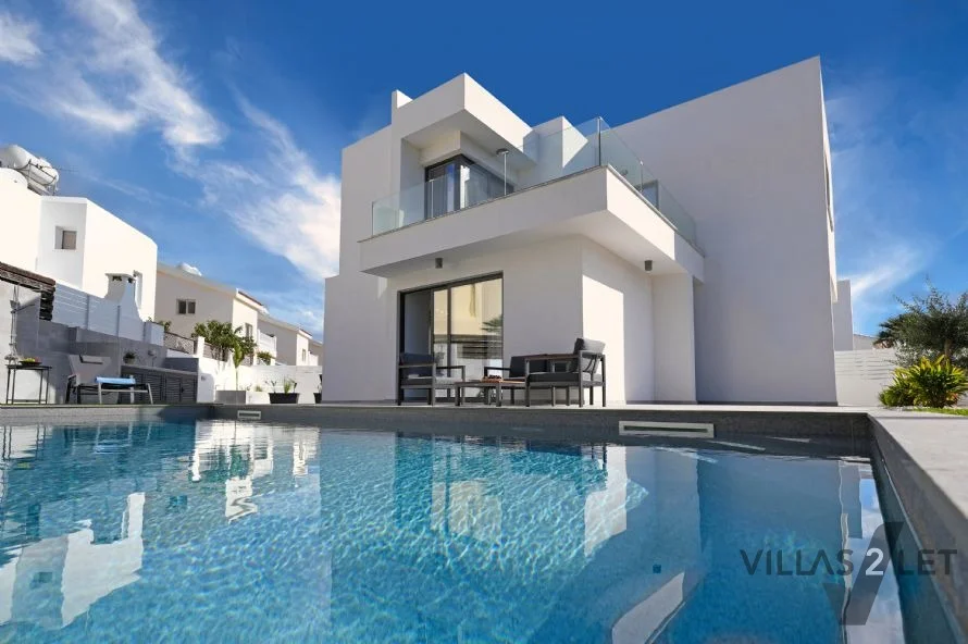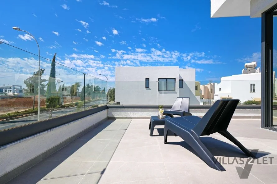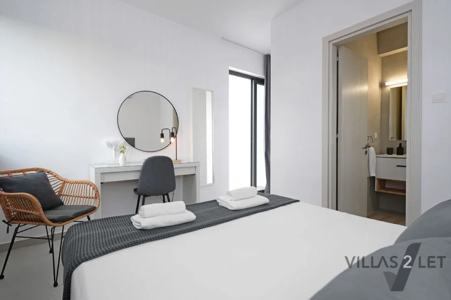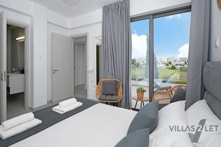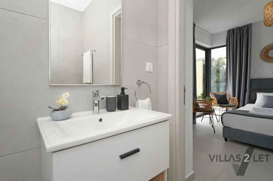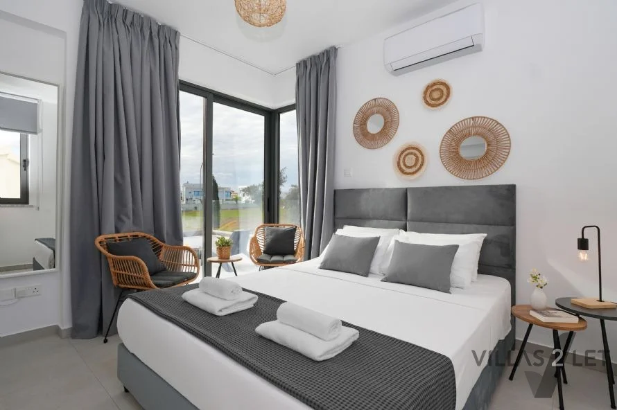 - The villa has three double bedrooms and three bathrooms; two en-suite double bedrooms on the first floor and one more double bedroom and bathroom on the ground level.
