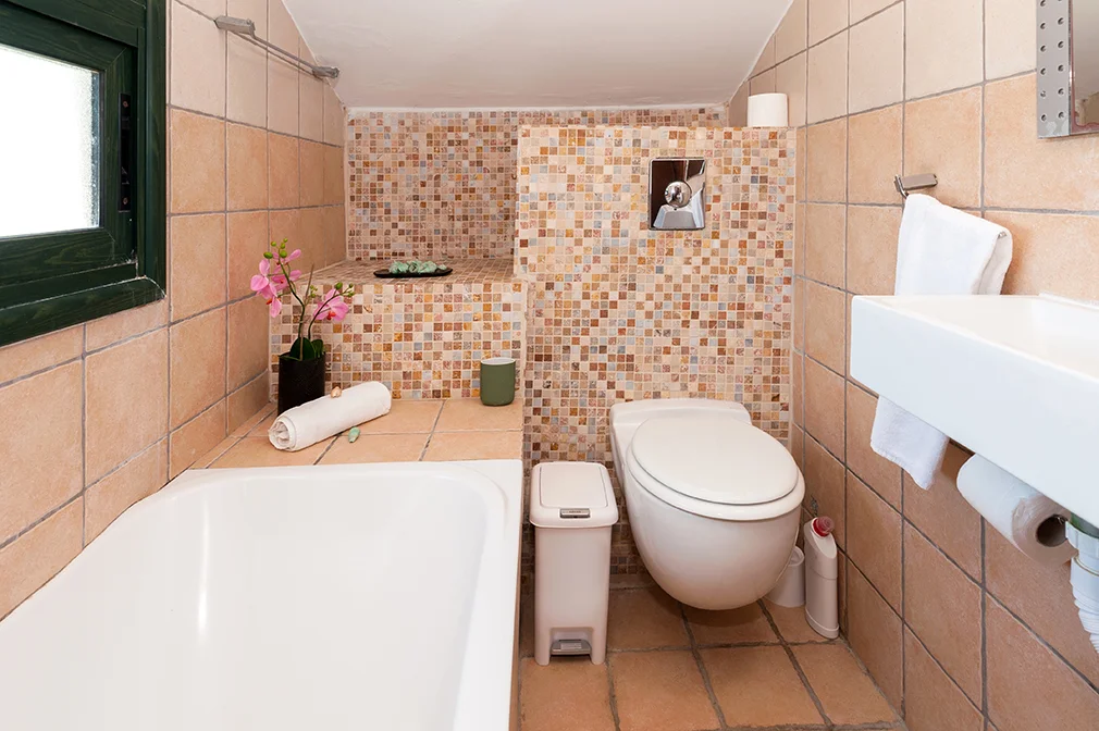 1 family bathroom with toilet and bath tub