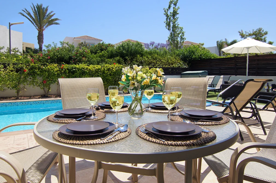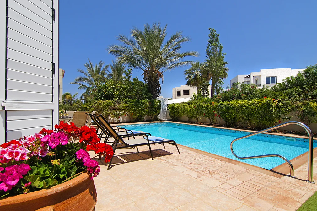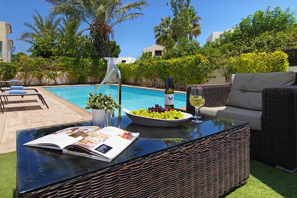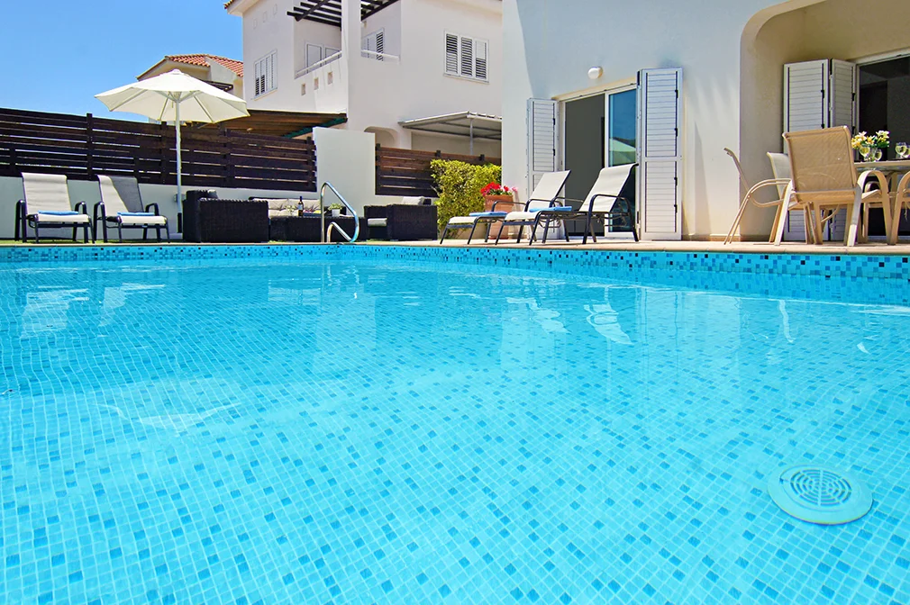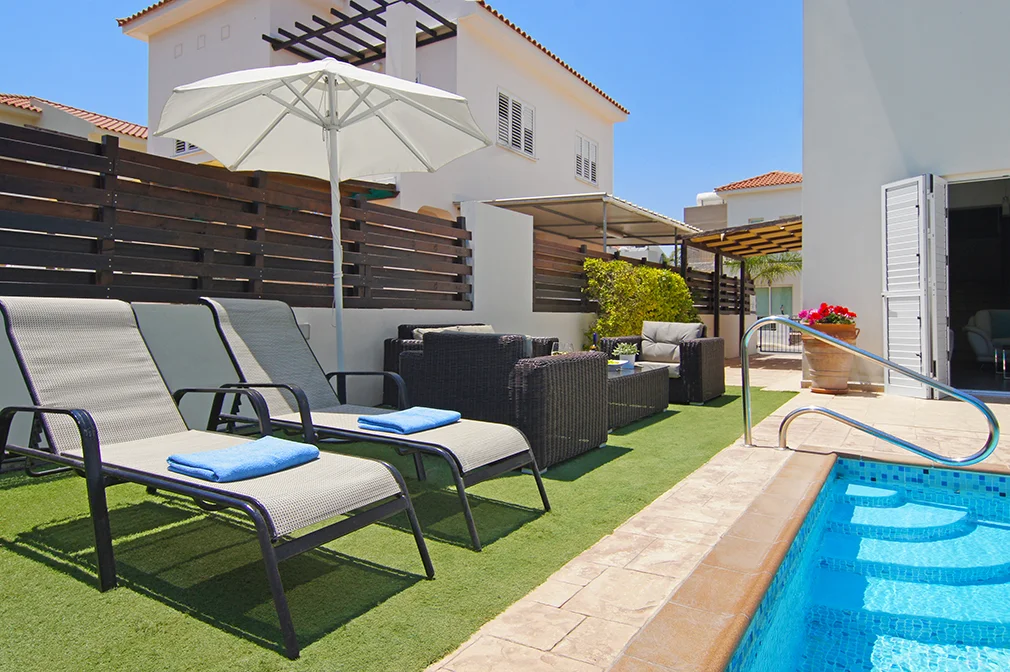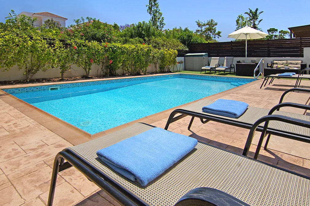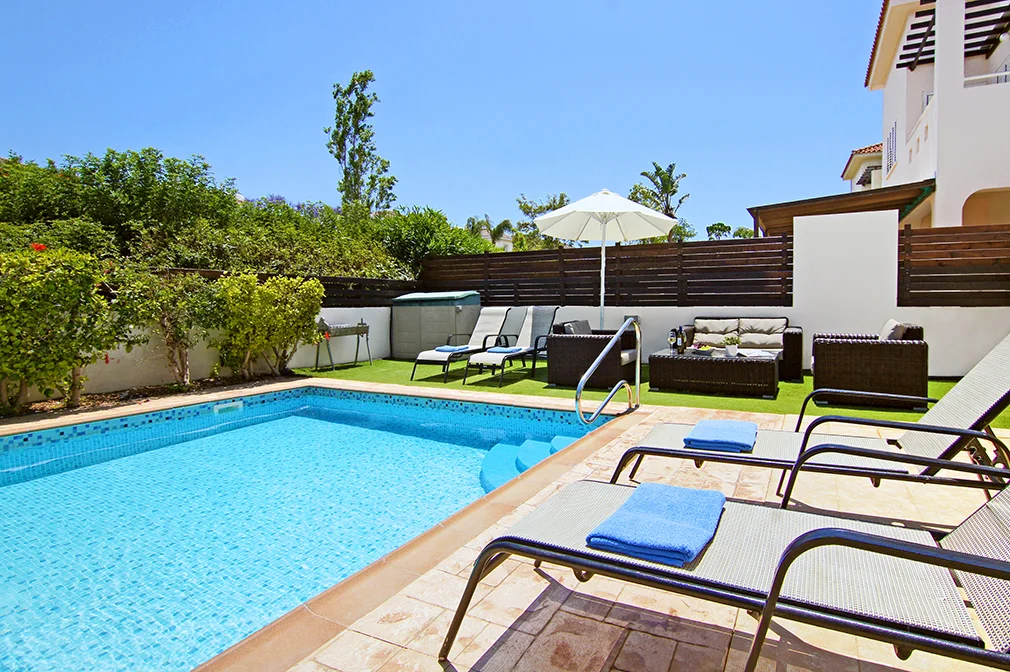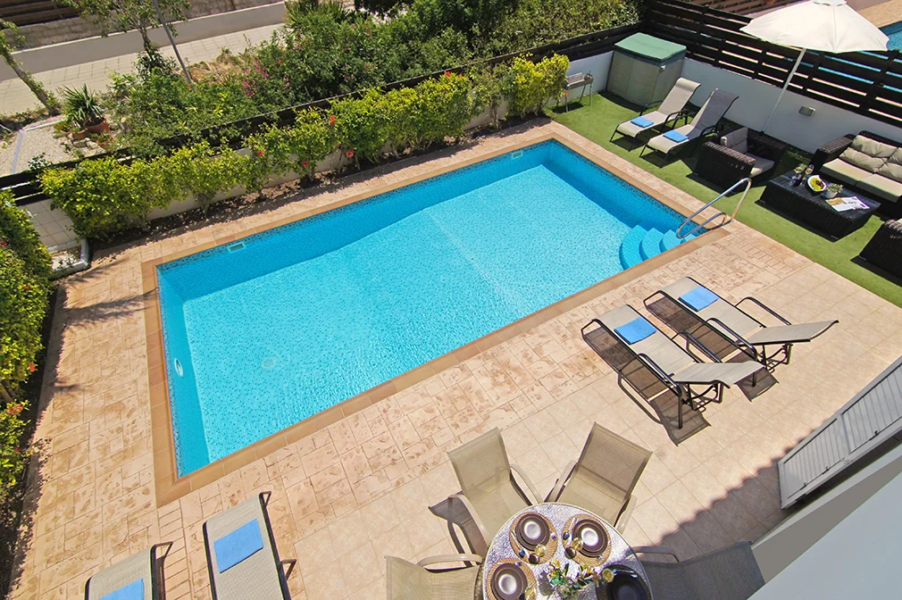 - The sliding doors from living area lead to a spacious sun terrace around lovely swimming pool, and surrounded by mature garden and fence to offer privacy to its guests