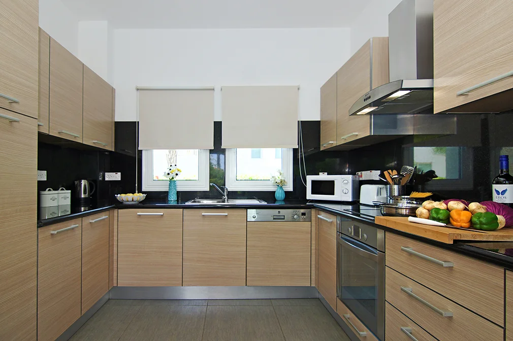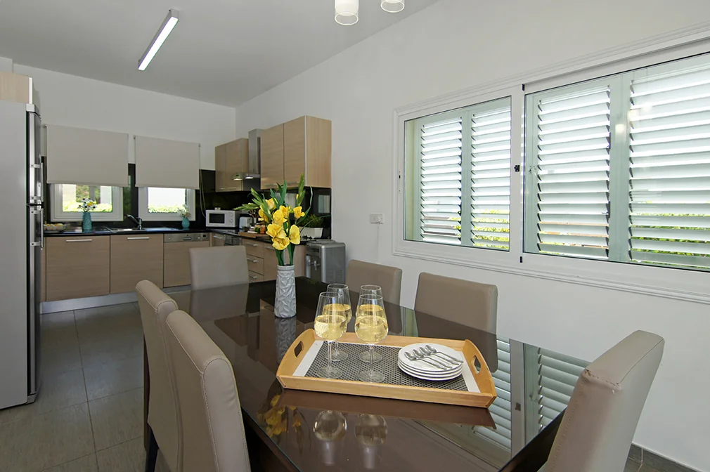 - There is a large, beautifully furnished living space with flat screen TV, fully fitted kitchen, dining area and guest toilet on the ground level.