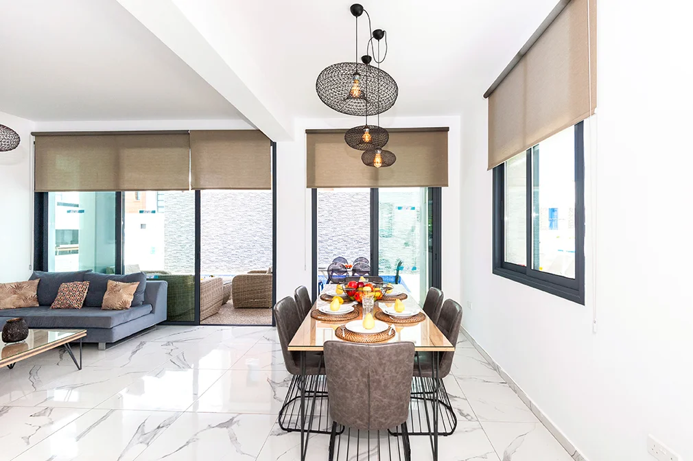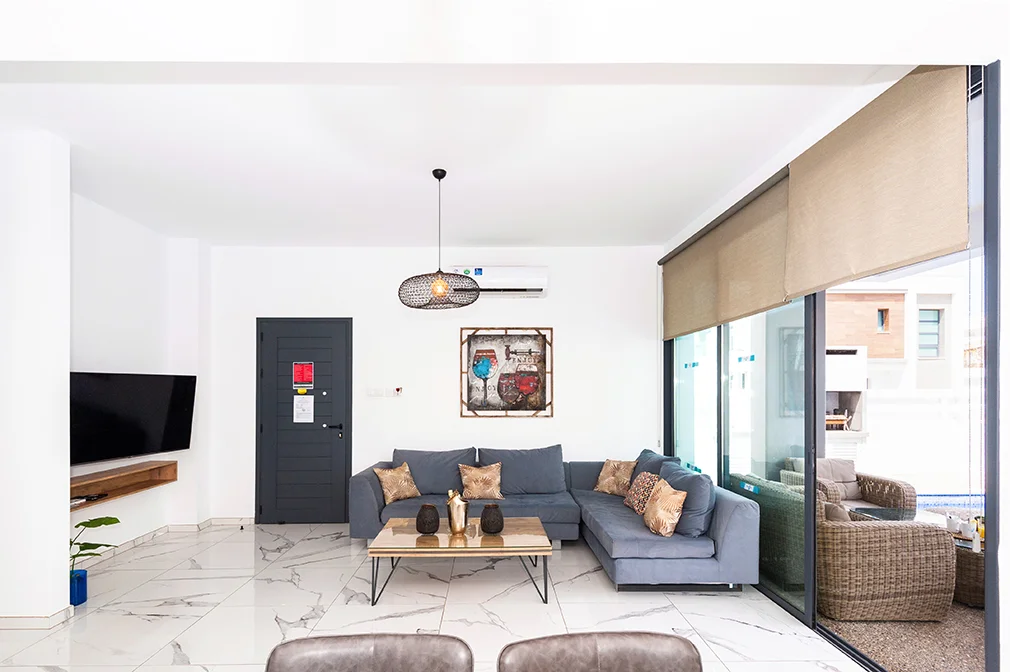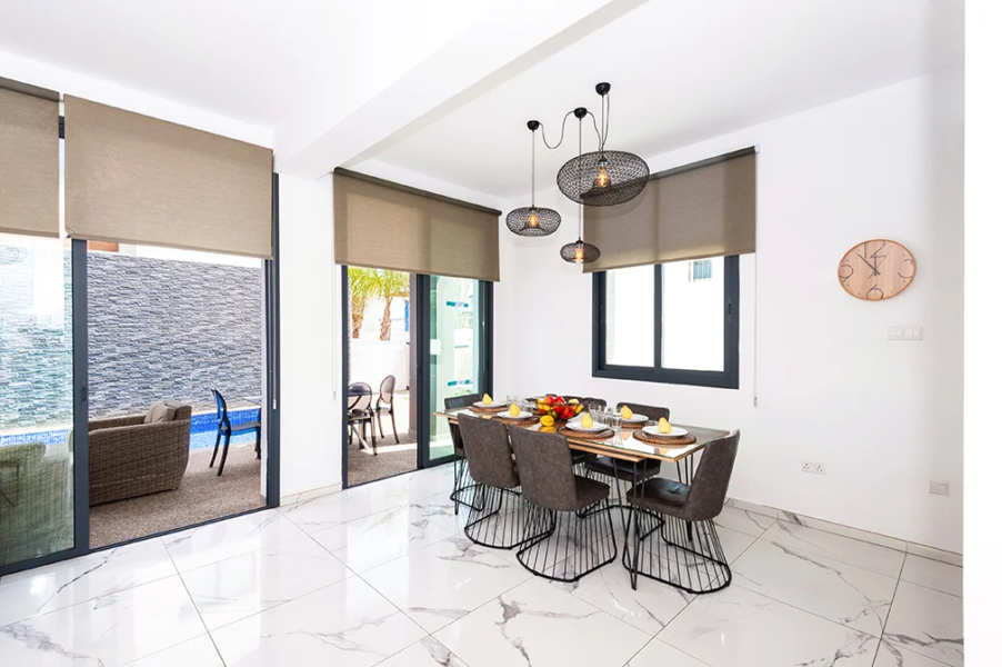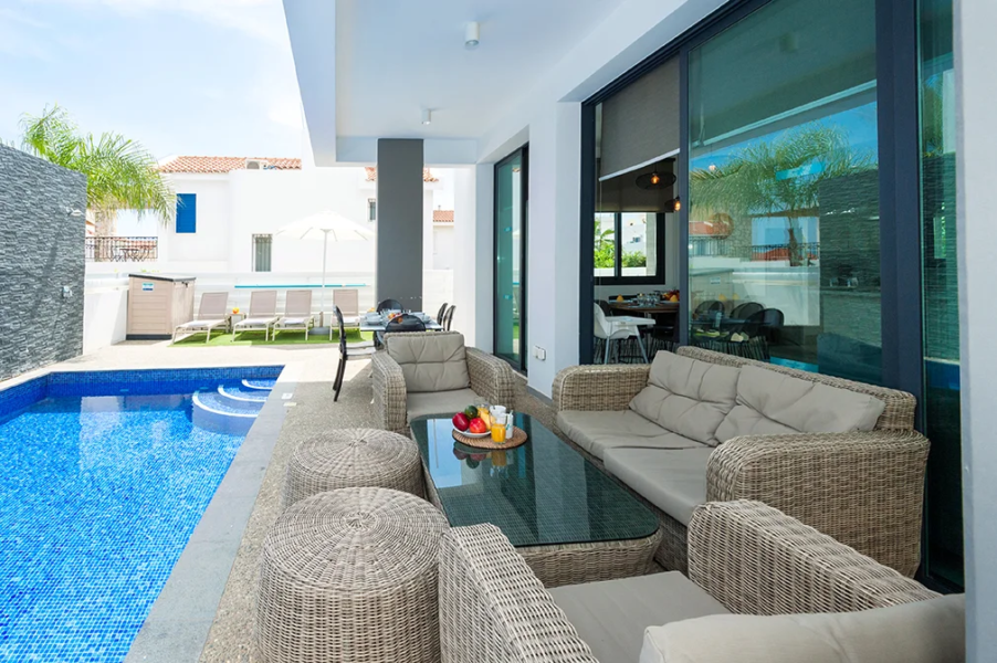 • This villa features a large living area with sliders opening out to patio perfect for outdoor dining and spacious well-maintained swimming pool area.
